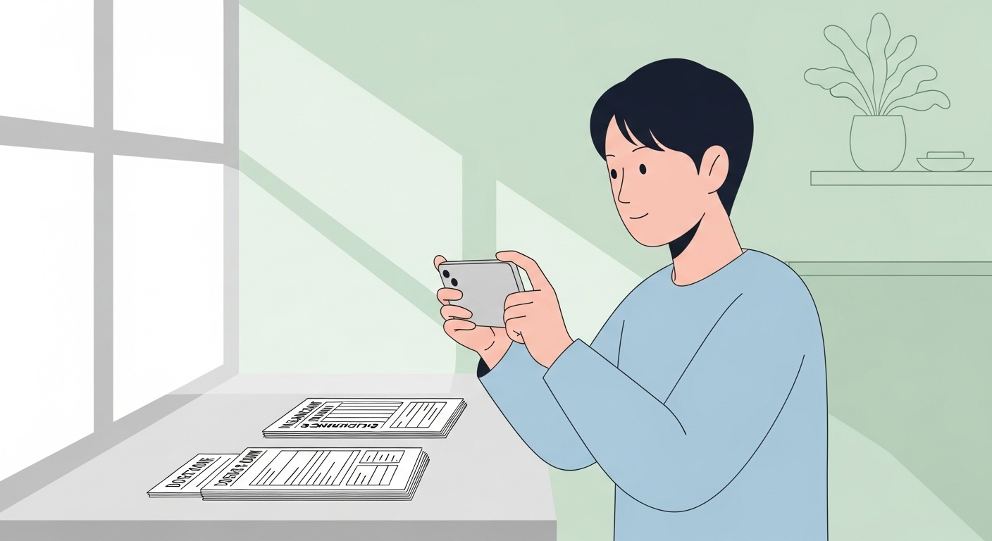 밝은 조명 아래에서 서류가 흔들리지 않도록 안정적으로 촬영해야 합니다.
